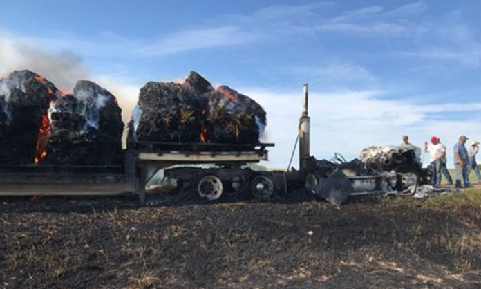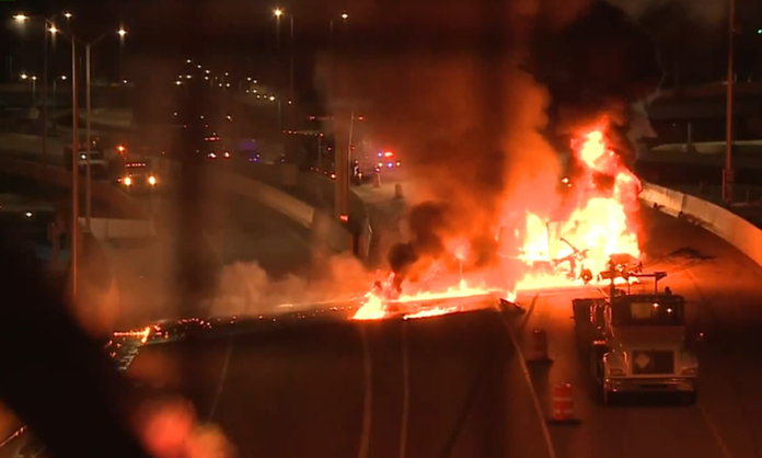 The highway was shut down for several hours as crews worked to extinguish the flames and clear the destroyed rig from the roadway.