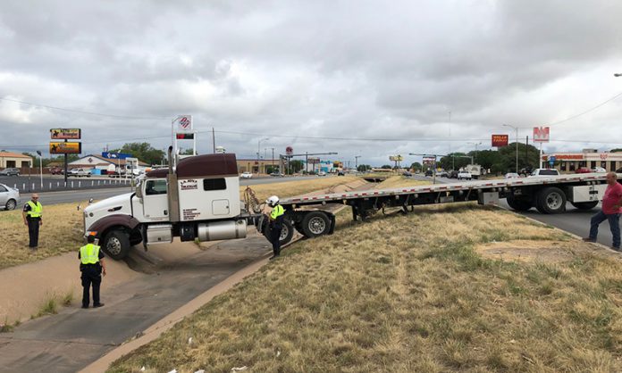 The semi truck was hauling storage containers and ended up lodged on top of a raised median.