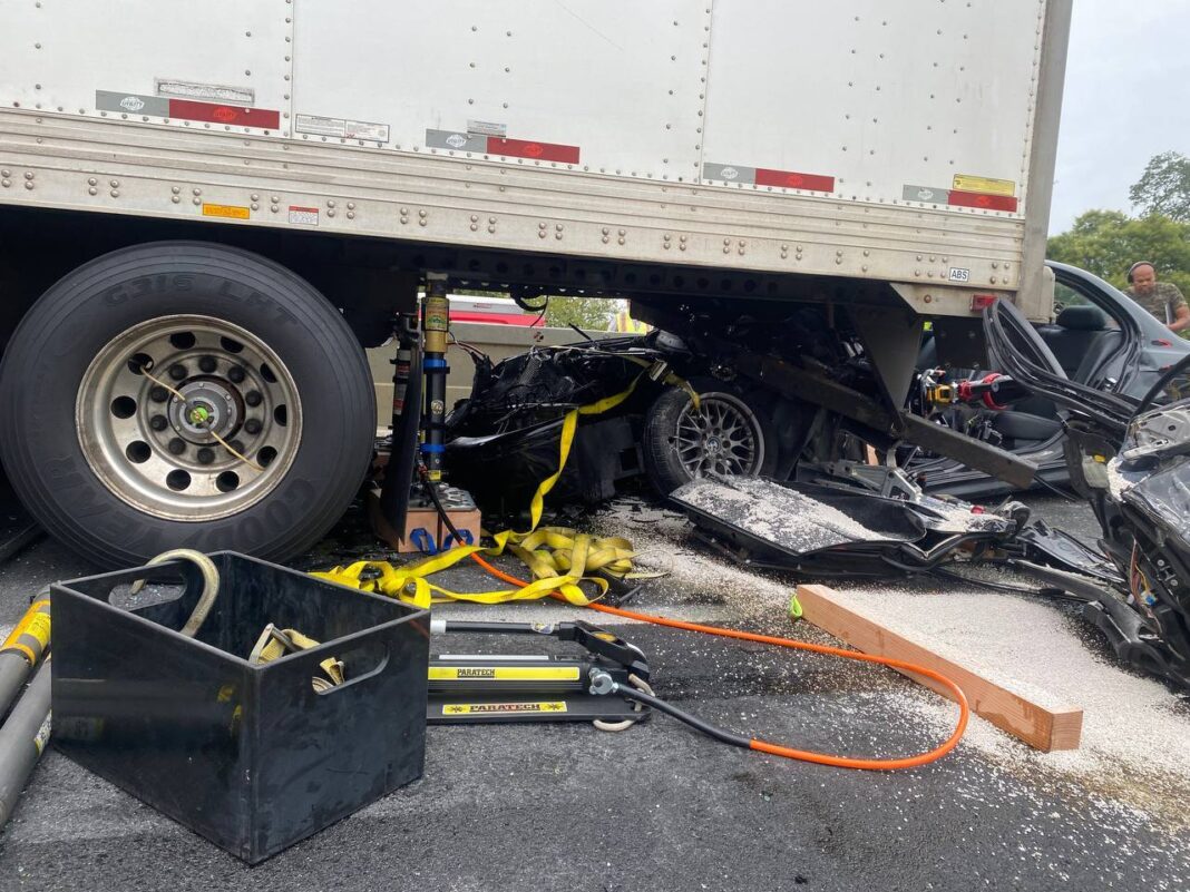 When crews arrived on scene, they found a car driver trapped and their vehicle lodged underneath a tractor trailer.