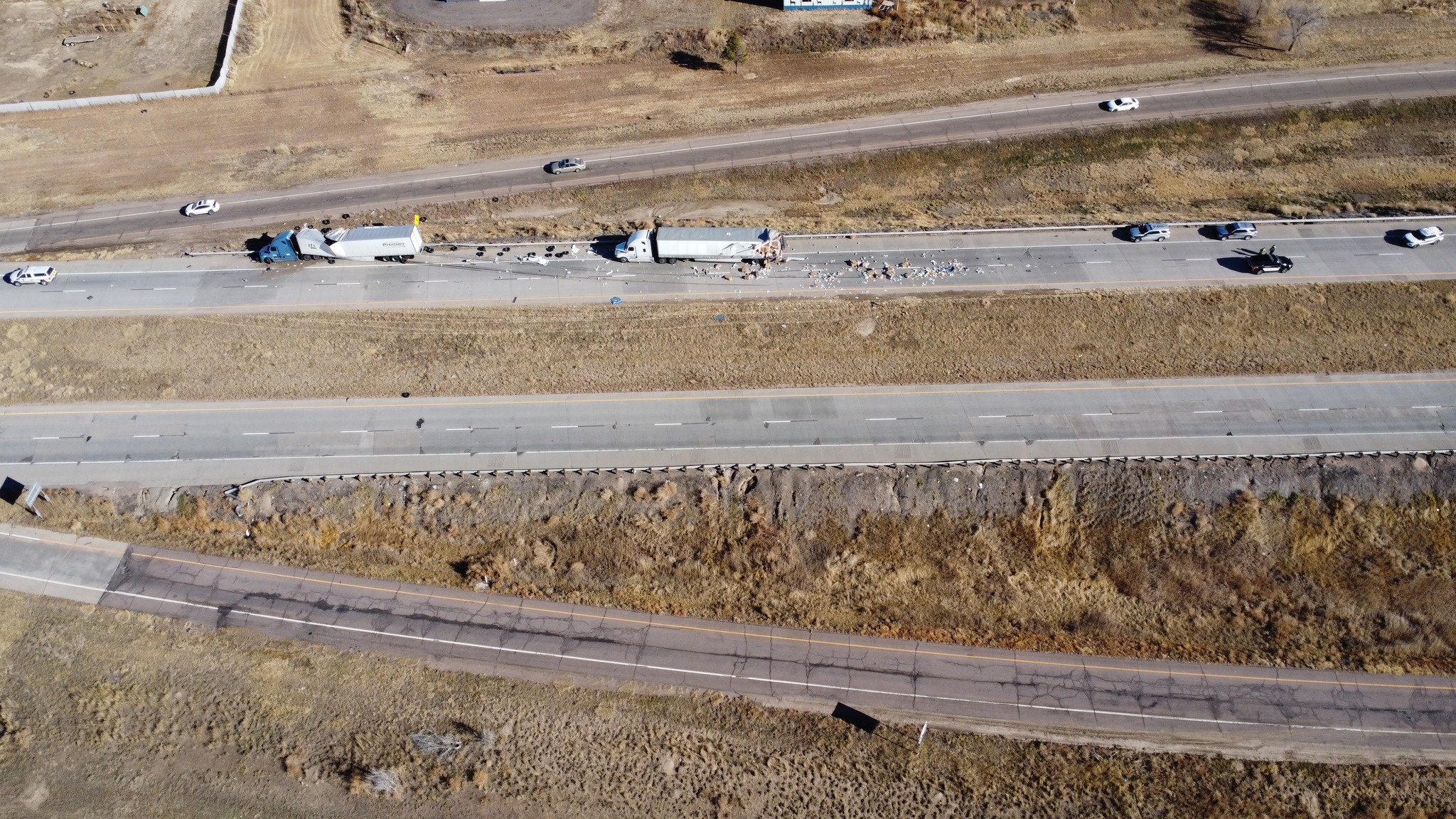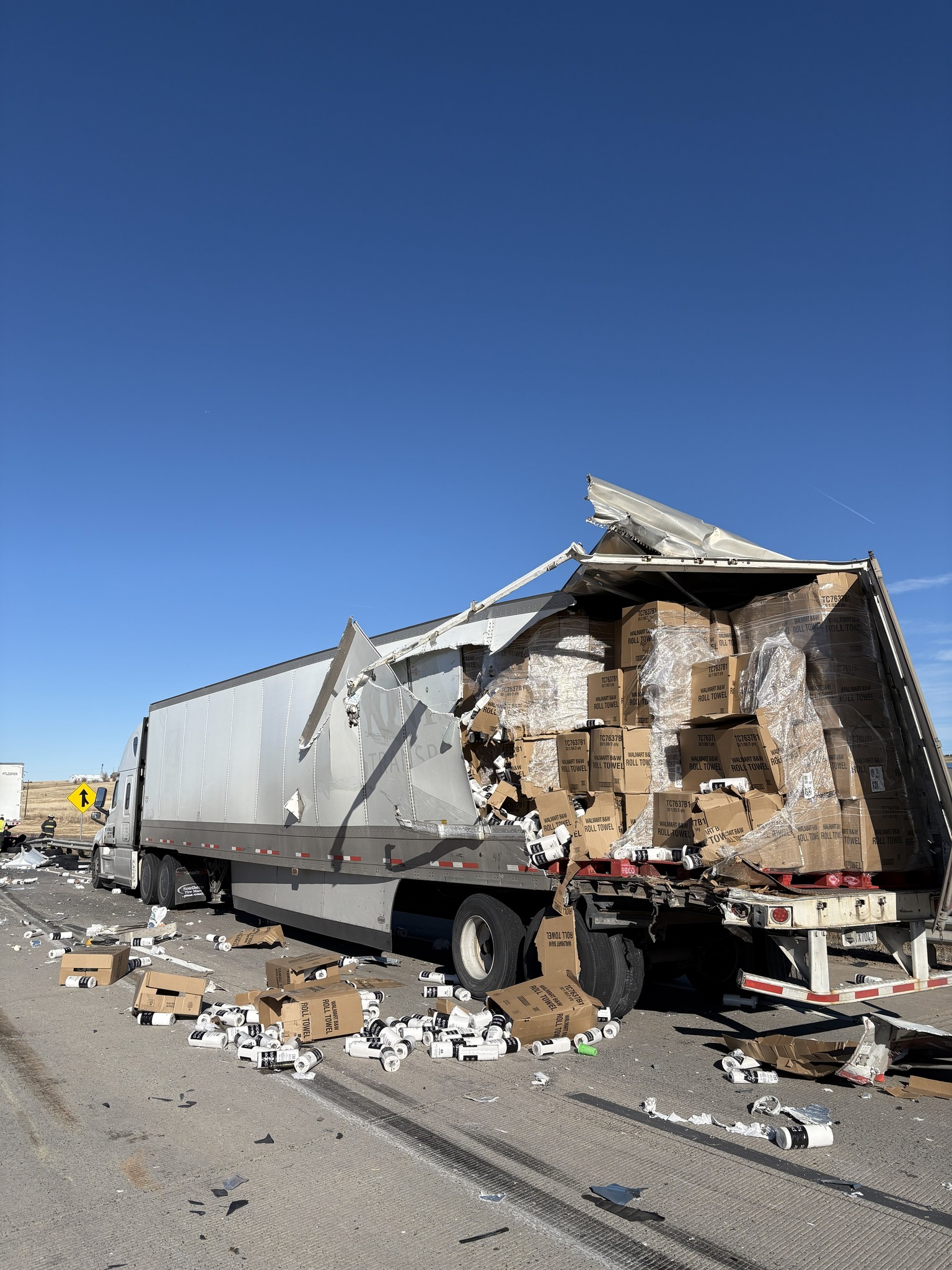 A two truck collision in Arapahoe County, Colorado, left the interstate littered with spilled cargo, including rolls of paper towels and tires.