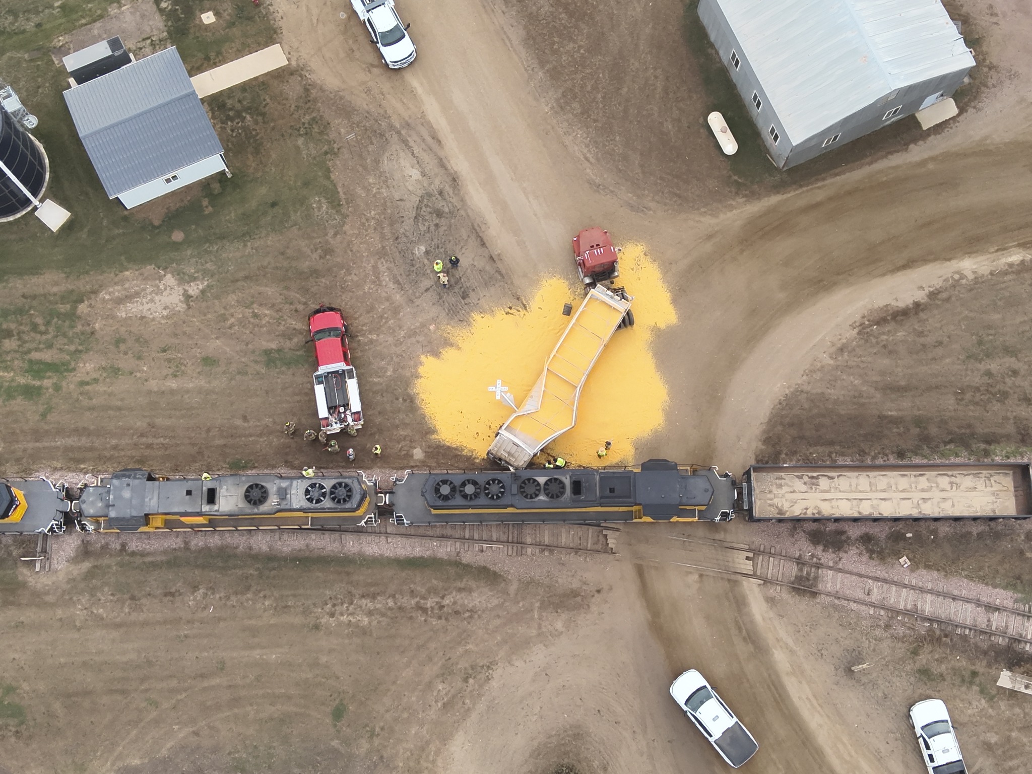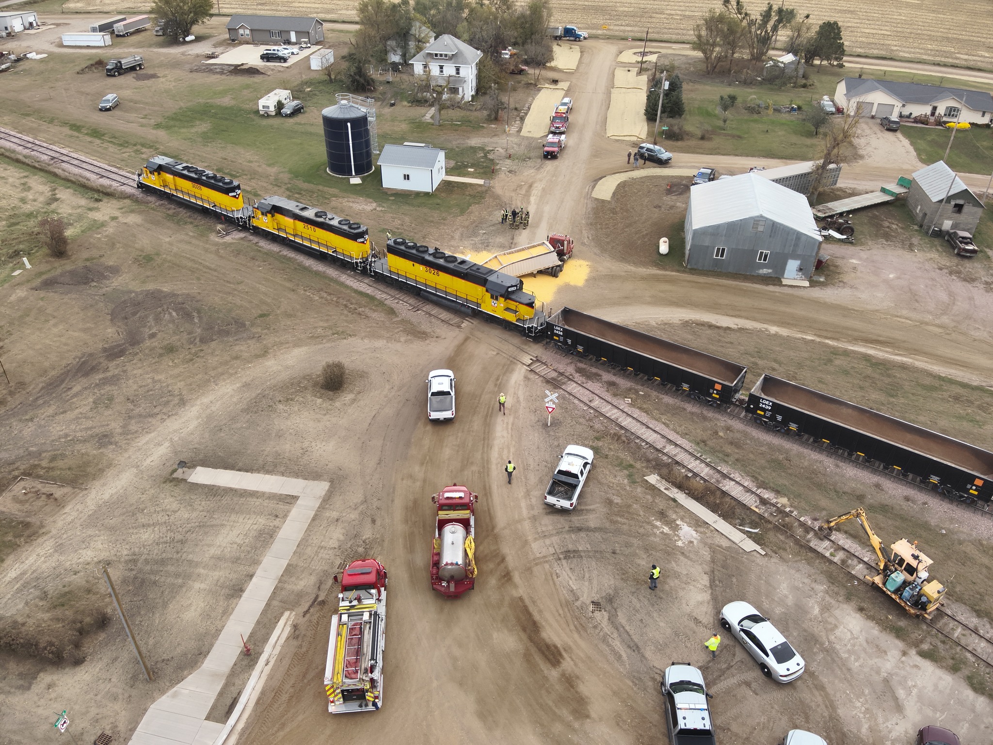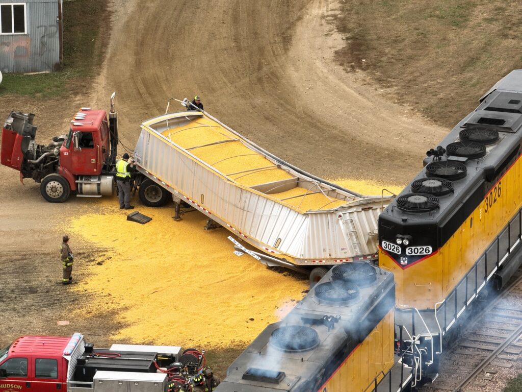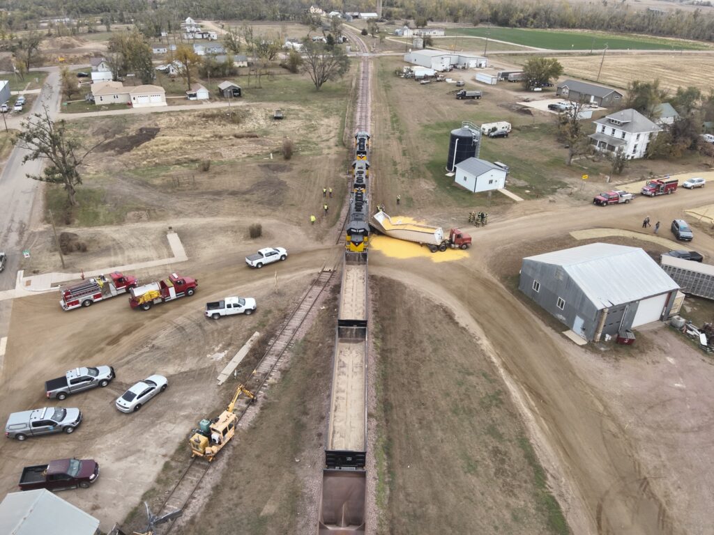 “Preliminary information suggests that the semi pulling a fully loaded grain trailer was heading eastbound on Wheelock St and passed over a set of railroad tracks just east of 3rd St. and failed to yield to the northbound train. The locomotive struck the passenger side rear axle area of the grain trailer causing damage to the trailer and three of the locomotives,” LCSO said.